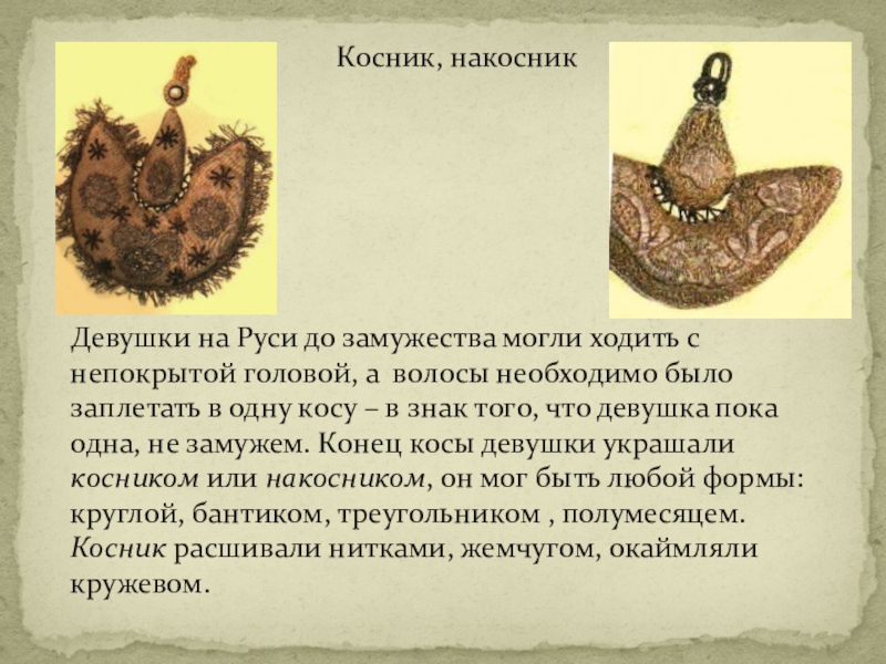 а волосы необходимо было заплетать в одну косу – в знак того, что девушка пока одна, не замужем. Конец косы девушки украшали косником или накосником, он мог быть любой формы: круглой, бантиком, треугольником , полумесяцем. Косник расшивали нитками, жемчугом, окаймляли кружевом.