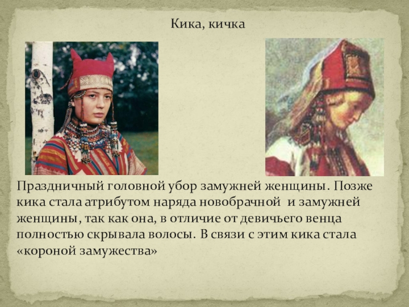 новобрачной и замужней женщины, так как она, в отличие от девичьего венца полностью скрывала волосы. В связи с этим кика стала «короной замужества»
