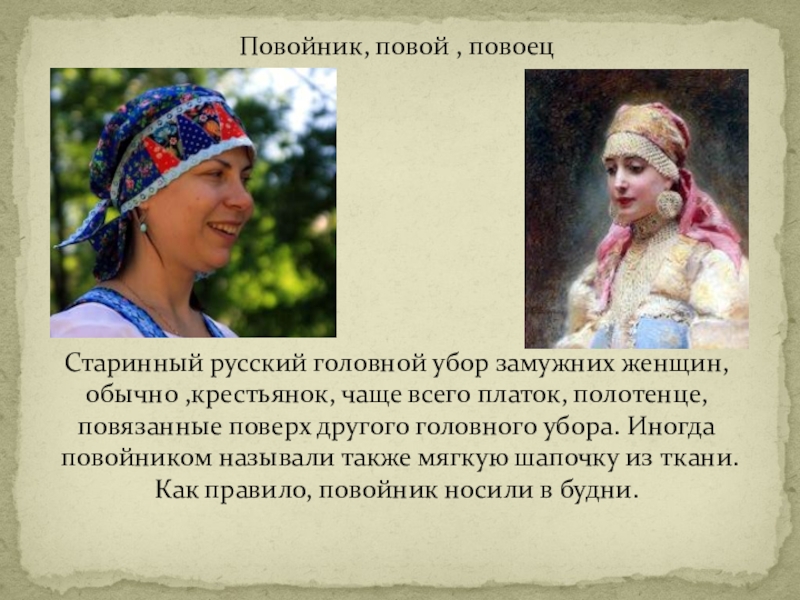 чаще всего платок, полотенце, повязанные поверх другого головного убора. Иногда повойником называли также мягкую шапочку из ткани. Как правило, повойник носили в будни.