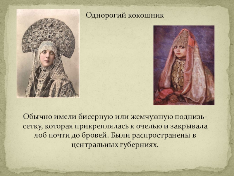 поднизь-сетку, которая прикреплялась к очелью и закрывала лоб почти до бровей. Были распространены в центральных губерниях.