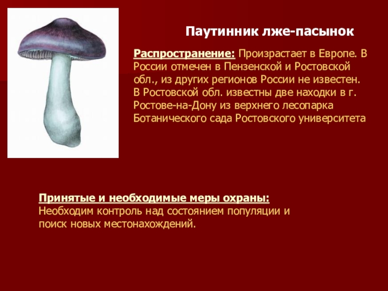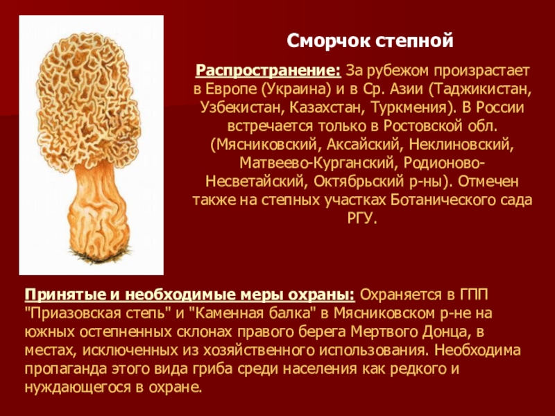 Принятые и необходимые меры охраны: Охраняется в ГПП "Приазовская степь" и "Каменная балка" в Мясниковском р-не на южных остепненных склонах правого берега Мертвого Донца, в местах, исключенных из хозяйственного использования. Необходима пропаганда этого вида гриба среди населения как редкого и нуждающегося в охране.