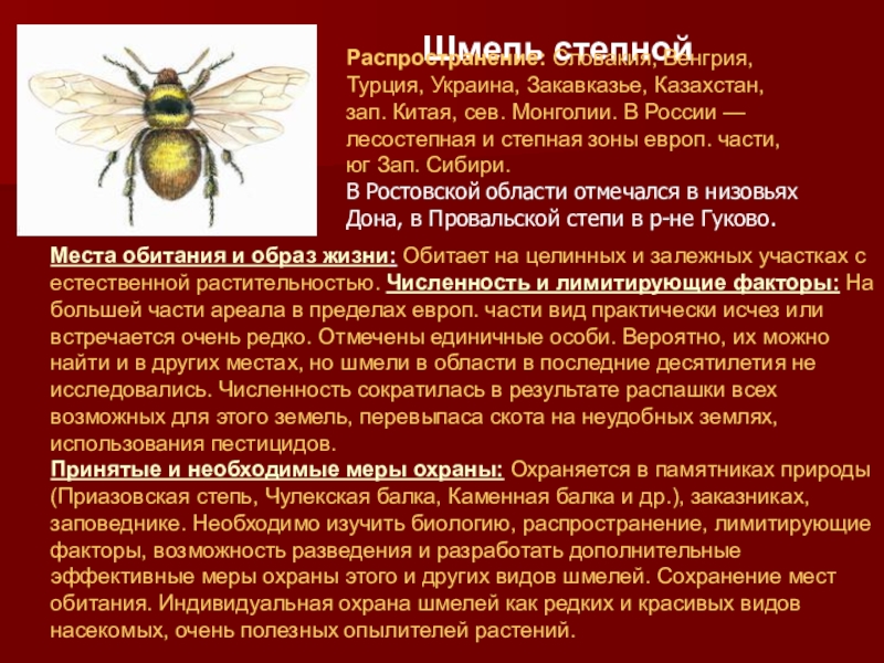 Места обитания и образ жизни: Обитает на целинных и залежных участках с естественной растительностью. Численность и лимитирующие факторы: На большей части ареала в пределах европ. части вид практически исчез или встречается очень редко. Отмечены единичные особи. Вероятно, их можно найти и в других местах, но шмели в области в последние десятилетия не исследовались. Численность сократилась в результате распашки всех возможных для этого земель, перевыпаса скота на неудобных землях, использования пестицидов.