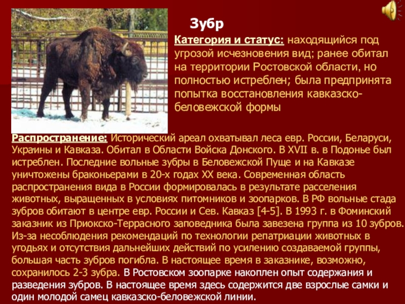 Распространение: Исторический ареал охватывал леса евр. России, Беларуси, Украины и Кавказа. Обитал в Области Войска Донского. В XVII в. в Подонье был истреблен. Последние вольные зубры в Беловежской Пуще и на Кавказе уничтожены браконьерами в 20-х годах ХХ века. Современная область распространения вида в России формировалась в результате расселения животных, выращенных в условиях питомников и зоопарков. В РФ вольные стада зубров обитают в центре евр. России и Сев. Кавказ [4-5]. В 1993 г. в Фоминский заказник из Приокско-Террасного заповедника была завезена группа из 10 зубров. Из-за несоблюдения рекомендаций по технологии репатриации животных в угодьях и отсутствия дальнейших действий по усилению создаваемой группы, большая часть зубров погибла. В настоящее время в заказнике, возможно, сохранилось 2-3 зубра. В Ростовском зоопарке накоплен опыт содержания и разведения зубров. В настоящее время здесь содержится две взрослые самки и один молодой самец кавказско-беловежской линии.