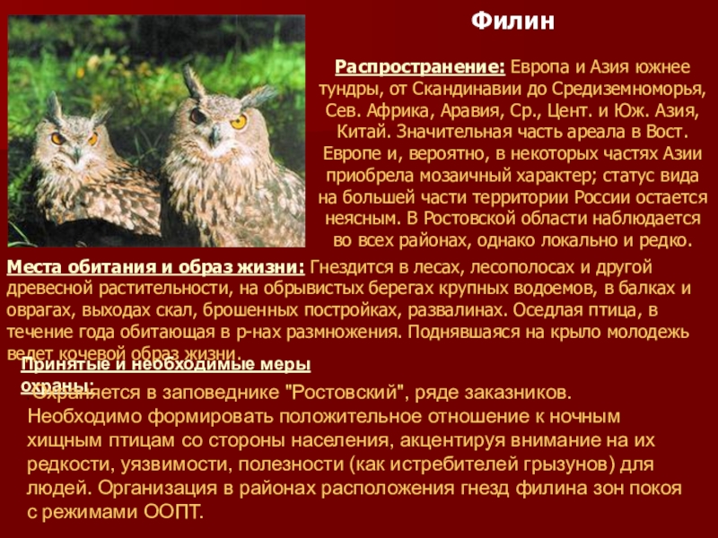 , Охраняется в заповеднике "Ростовский", ряде заказников. Необходимо формировать положительное отношение к ночным хищным птицам со стороны населения, акцентируя внимание на их редкости, уязвимости, полезности (как истребителей грызунов) для людей. Организация в районах расположения гнезд филина зон покоя с режимами ООПТ.