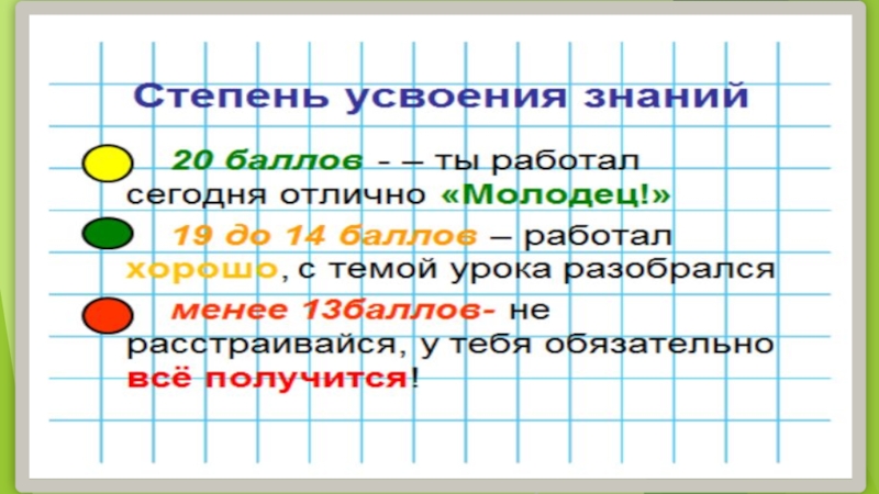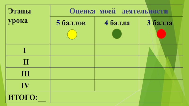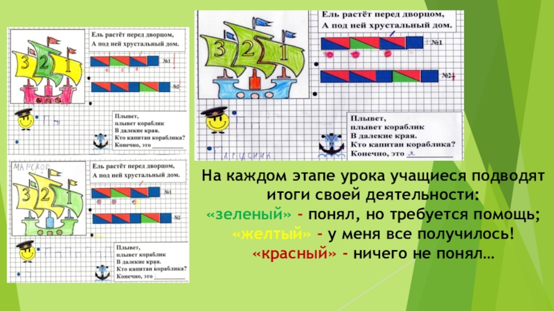 Слайд 10На каждом этапе урока учащиеся подводят итоги своей деятельности: «зеленый» - понял,