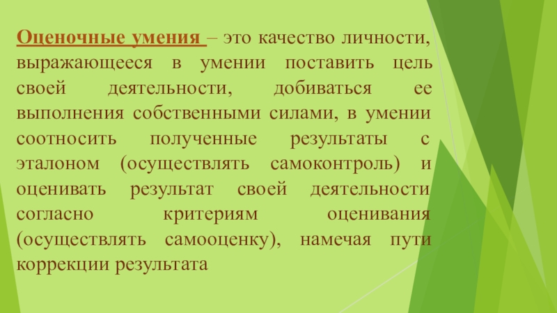Оценочные умения – это качество личности, выражающееся в умении поставить цель своей деятельности, добиваться ее выполнения собственными