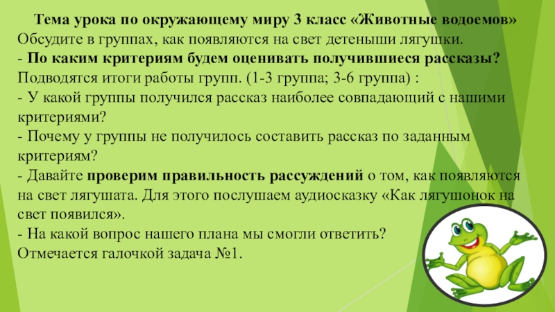 Тема урока по окружающему миру 3 класс «Животные водоемов»Обсудите в группах, как появляются на свет детеныши лягушки.-