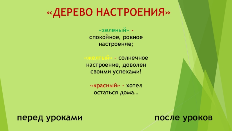 «ДЕРЕВО НАСТРОЕНИЯ»перед урокамипосле уроков«зеленый» - спокойное, ровное настроение; «желтый» - солнечное настроение, доволен своими успехами! «красный» -