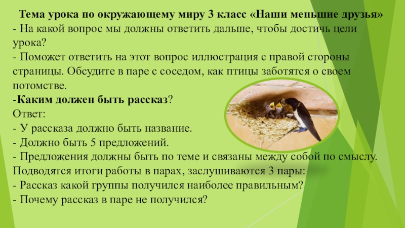 - Поможет ответить на этот вопрос иллюстрация с правой стороны страницы. Обсудите в паре с соседом, как птицы заботятся о своем потомстве.