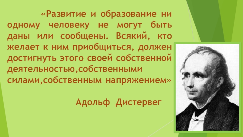 могут быть даны или сообщены. Всякий, кто желает к ним приобщиться, должен достигнуть этого своей собственной деятельностью,собственными силами,собственным напряжением» Адольф Дистервег