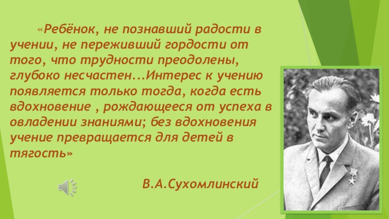 переживший гордости от того, что трудности преодолены, глубоко несчастен...Интерес к учению появляется только тогда, когда есть вдохновение , рождающееся от успеха в овладении знаниями; без вдохновения учение превращается для детей в тягость» В.А.Сухомлинский
