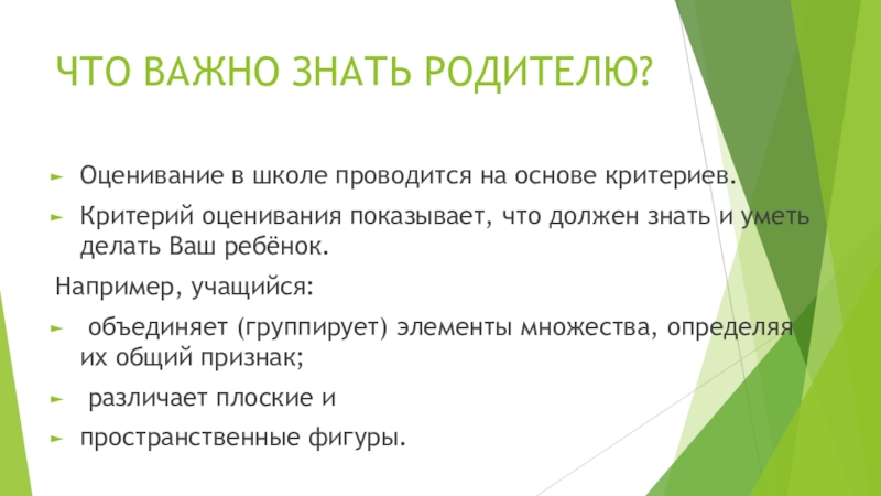 ЧТО ВАЖНО ЗНАТЬ РОДИТЕЛЮ?Оценивание в школе проводится на основе критериев.Критерий оценивания показывает, что должен знать и уметь делать Ваш ребёнок.Например, учащийся: объединяет (группирует) элементы множества, определяя их общий признак; различает плоские и пространственные фигуры.