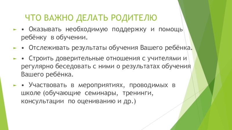 ЧТО ВАЖНО ДЕЛАТЬ РОДИТЕЛЮ• Оказывать необходимую поддержку и помощь ребёнку в обучении.• Отслеживать результаты обучения