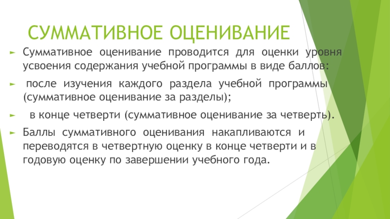 Баллы суммативного оценивания накапливаются и переводятся в четвертную оценку в конце четверти и в годовую оценку по завершении учебного года.