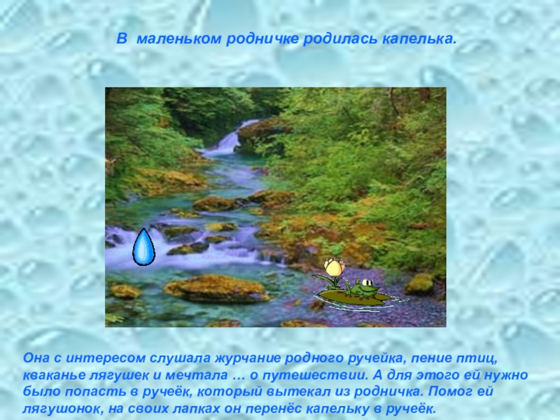 В маленьком родничке родилась капелька.Она с интересом слушала журчание родного ручейка, пение птиц, кваканье лягушек и мечтала … о путешествии. А для этого ей нужно было попасть в ручеёк, который вытекал из родничка. Помог ей лягушонок,