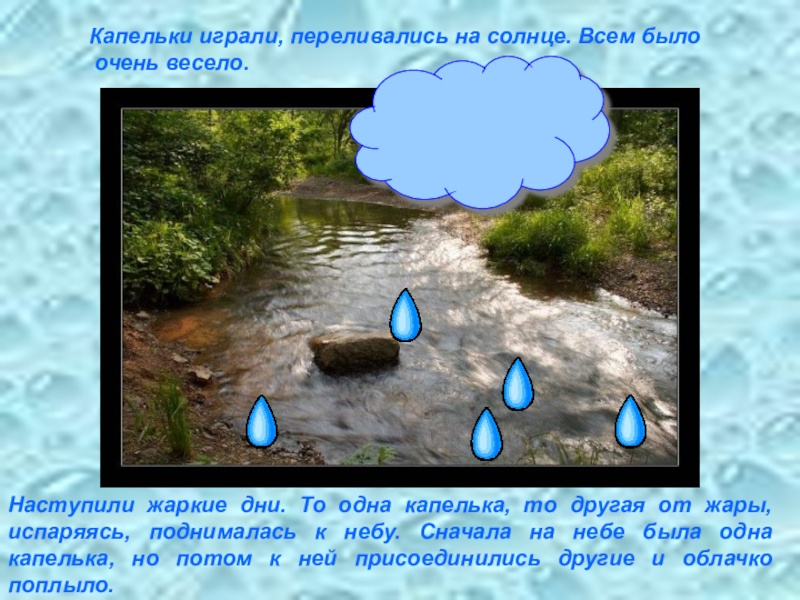 Капельки играли, переливались на солнце. Всем было очень весело.Наступили жаркие дни. То одна капелька, то другая от