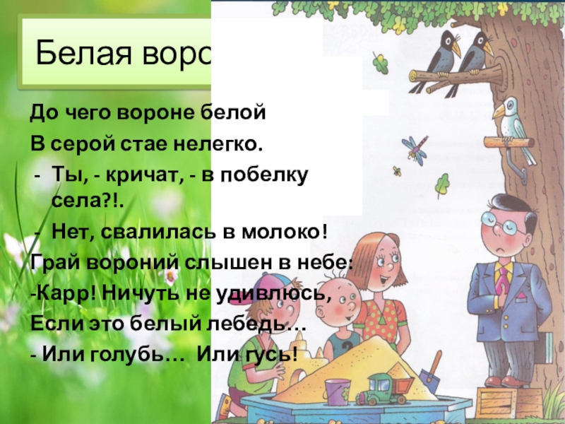Белая воронаДо чего вороне белойВ серой стае нелегко.Ты, - кричат, - в побелку села?!.Нет, свалилась в молоко!Грай