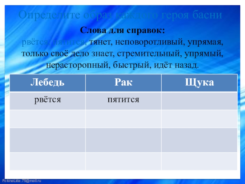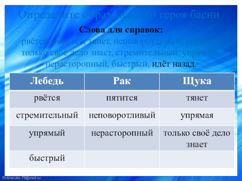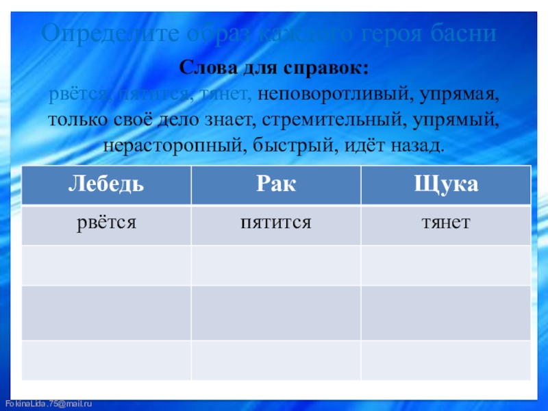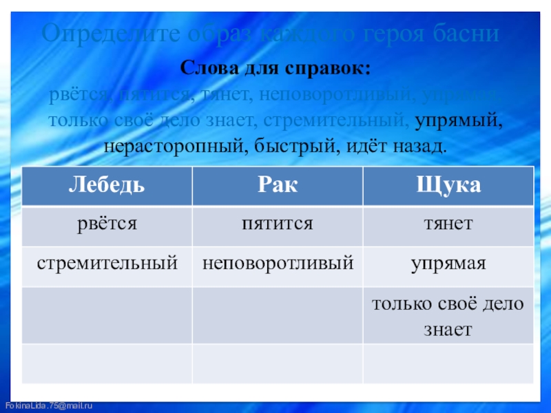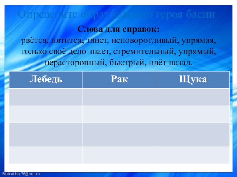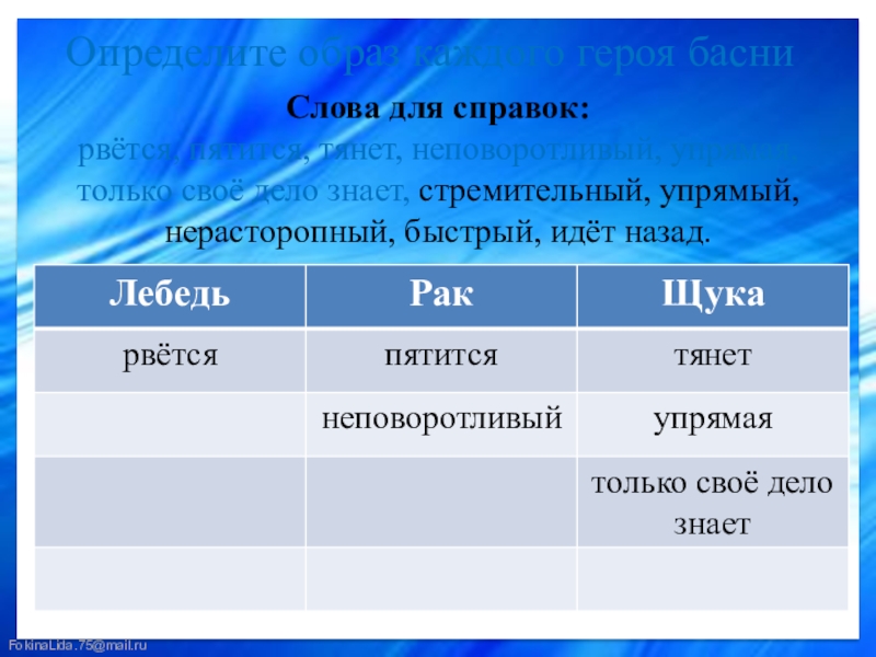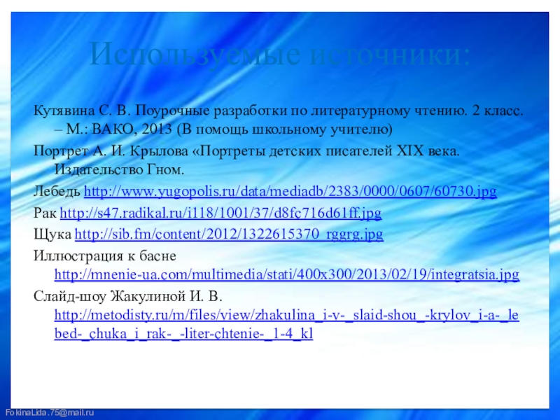 Слайд-шоу Жакулиной И. В. http://metodisty.ru/m/files/view/zhakulina_i-v-_slaid-shou_-krylov_i-a-_lebed-_chuka_i_rak-_-liter-chtenie-_1-4_kl