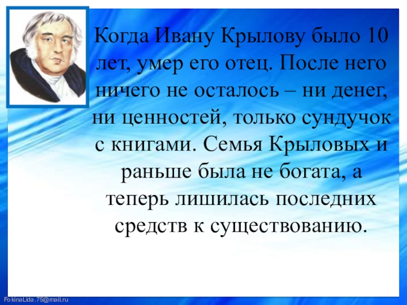 Слайд 6Когда Ивану Крылову было 10 лет, умер его отец. После него