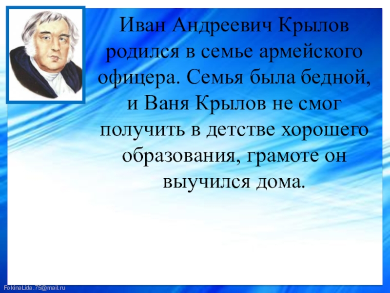 Слайд 4Иван Андреевич Крылов родился в семье армейского офицера. Семья была бедной,