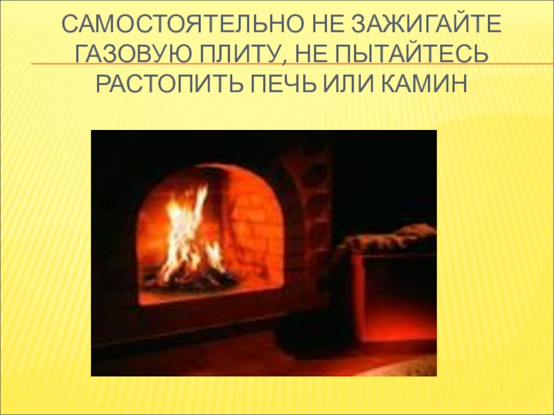 Слайд 14САМОСТОЯТЕЛЬНО НЕ ЗАЖИГАЙТЕ ГАЗОВУЮ ПЛИТУ, НЕ ПЫТАЙТЕСЬ РАСТОПИТЬ ПЕЧЬ ИЛИ КАМИН