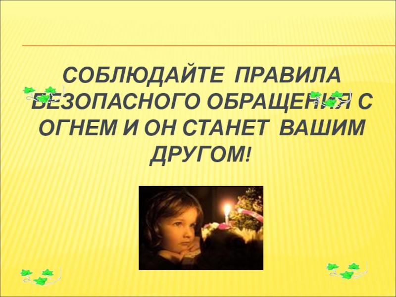 Слайд 21СОБЛЮДАЙТЕ ПРАВИЛА БЕЗОПАСНОГО ОБРАЩЕНИЯ С ОГНЕМ И ОН СТАНЕТ ВАШИМ ДРУГОМ!