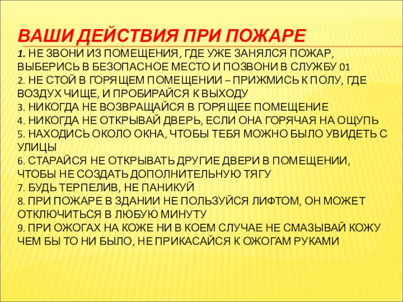 ПОЖАР, ВЫБЕРИСЬ В БЕЗОПАСНОЕ МЕСТО И ПОЗВОНИ В СЛУЖБУ 01 2. НЕ СТОЙ В ГОРЯЩЕМ ПОМЕЩЕНИИ – ПРИЖМИСЬ К ПОЛУ, ГДЕ ВОЗДУХ ЧИЩЕ, И ПРОБИРАЙСЯ К ВЫХОДУ 3. НИКОГДА НЕ ВОЗВРАЩАЙСЯ В ГОРЯЩЕЕ ПОМЕЩЕНИЕ 4. НИКОГДА НЕ ОТКРЫВАЙ ДВЕРЬ, ЕСЛИ ОНА ГОРЯЧАЯ НА ОЩУПЬ 5. НАХОДИСЬ ОКОЛО ОКНА, ЧТОБЫ ТЕБЯ МОЖНО БЫЛО УВИДЕТЬ С УЛИЦЫ 6. СТАРАЙСЯ НЕ ОТКРЫВАТЬ ДРУГИЕ ДВЕРИ В ПОМЕЩЕНИИ, ЧТОБЫ НЕ СОЗДАТЬ ДОПОЛНИТЕЛЬНУЮ ТЯГУ 7. БУДЬ ТЕРПЕЛИВ, НЕ ПАНИКУЙ 8. ПРИ ПОЖАРЕ В ЗДАНИИ НЕ ПОЛЬЗУЙСЯ ЛИФТОМ, ОН МОЖЕТ ОТКЛЮЧИТЬСЯ В ЛЮБУЮ МИНУТУ 9. ПРИ ОЖОГАХ НА КОЖЕ НИ В КОЕМ СЛУЧАЕ НЕ СМАЗЫВАЙ КОЖУ ЧЕМ БЫ ТО НИ БЫЛО, НЕ ПРИКАСАЙСЯ К ОЖОГАМ РУКАМИ