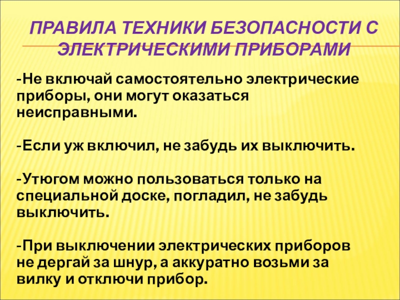 ПРАВИЛА ТЕХНИКИ БЕЗОПАСНОСТИ С ЭЛЕКТРИЧЕСКИМИ ПРИБОРАМИ-Не включай самостоятельно электрические приборы, они могут оказаться неисправными. -Если уж включил,