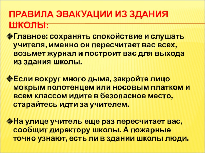 ПРАВИЛА ЭВАКУАЦИИ ИЗ ЗДАНИЯ ШКОЛЫ:Главное: сохранять спокойствие и слушать учителя, именно он пересчитает вас всех, возьмет журнал