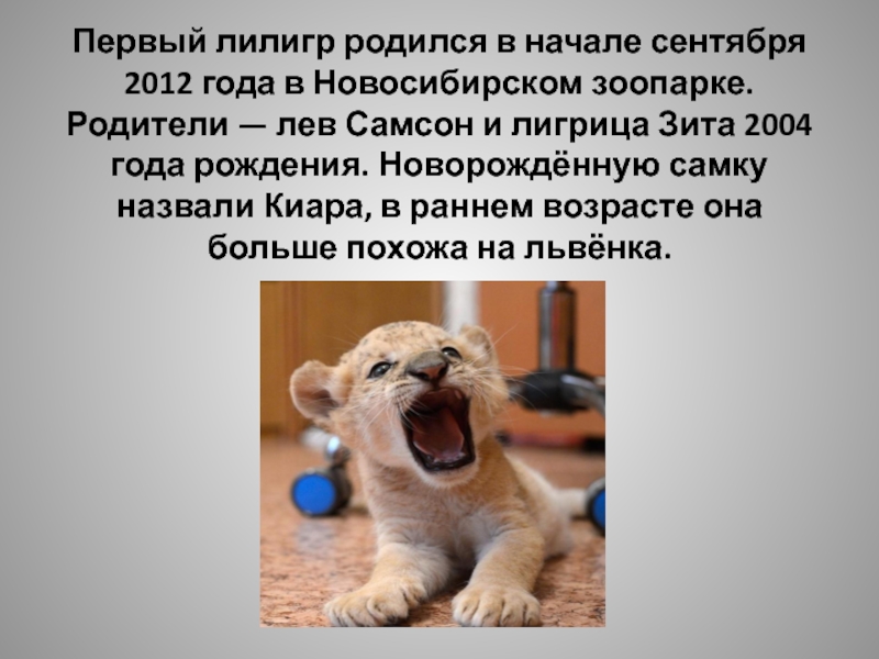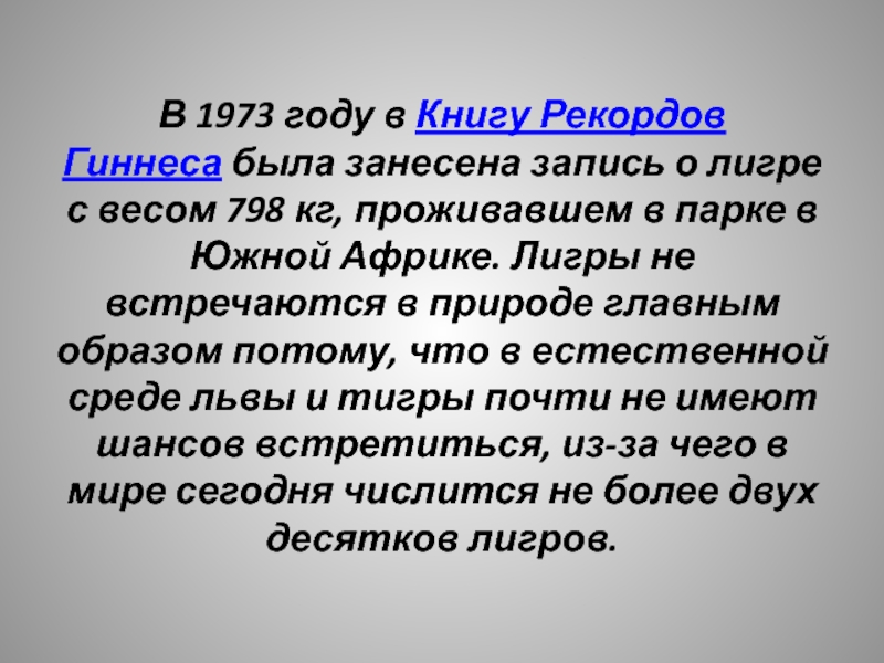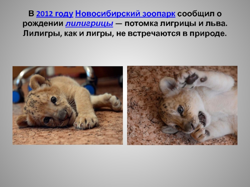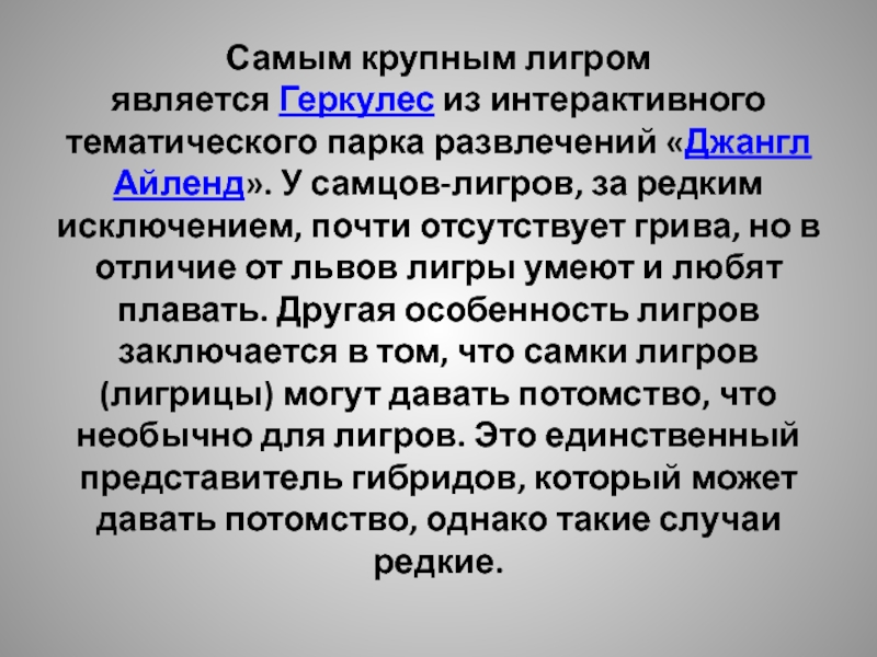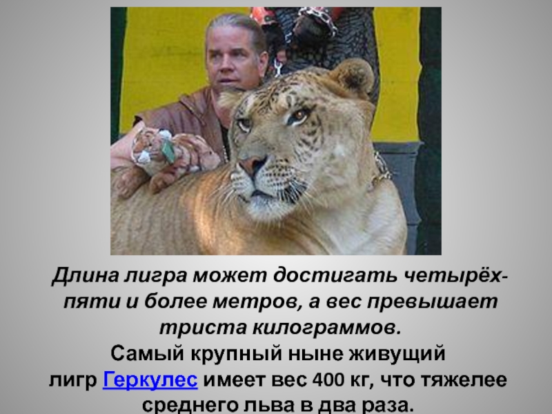 Самый крупный ныне живущий лигр Геркулес имеет вес 400 кг, что тяжелее среднего льва в два раза.