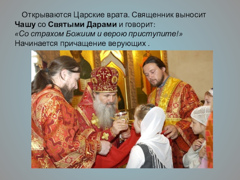 Священник торжественно выносит Святые Дары – хлеб и вино – из северных врат Алтаря.