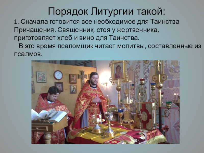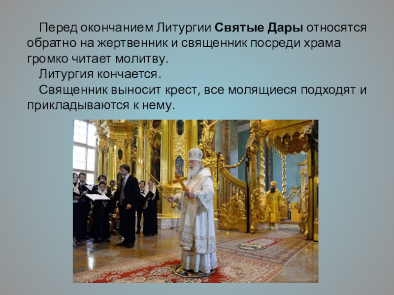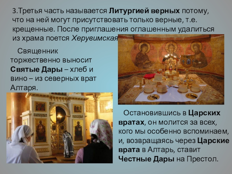 Остановившись в Царских вратах, он молится за всех, кого мы особенно вспоминаем, и, возвращаясь через Царские врата в Алтарь, ставит Честные Дары на Престол.