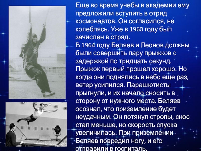 В 1964 году Беляев и Леонов должны были совершить пару прыжков с задержкой по тридцать секунд. Прыжок первый прошел хорошо. Но когда они поднялись в небо еще раз, ветер усилился. Парашютисты прыгнули, и их начало сносить в сторону от нужного места. Беляев осознал, что приземление будет неудачным. Он потянул стропы, снос стал меньше, но скорость спуска увеличилась. При приземлении Беляев повредил ногу, и его отправили в госпиталь.