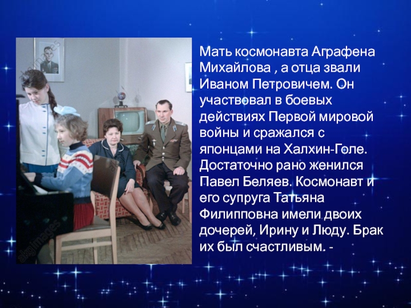 Слайд 12Мать космонавта Аграфена Михайлова , а отца звали Иваном Петровичем. Он
