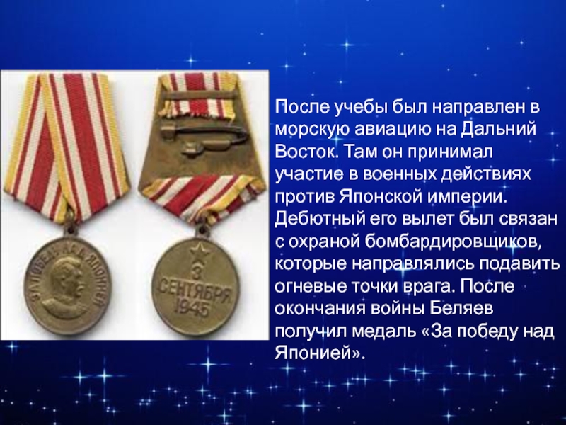 Дебютный его вылет был связан с охраной бомбардировщиков, которые направлялись подавить огневые точки врага. После окончания войны Беляев получил медаль «За победу над Японией».