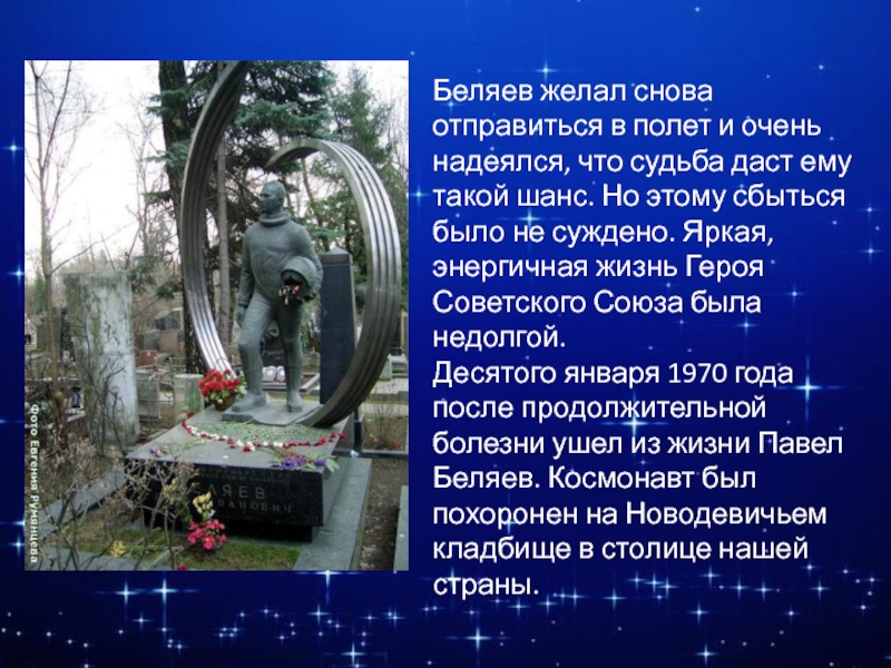Десятого января 1970 года после продолжительной болезни ушел из жизни Павел Беляев. Космонавт был похоронен на Новодевичьем кладбище в столице нашей страны.