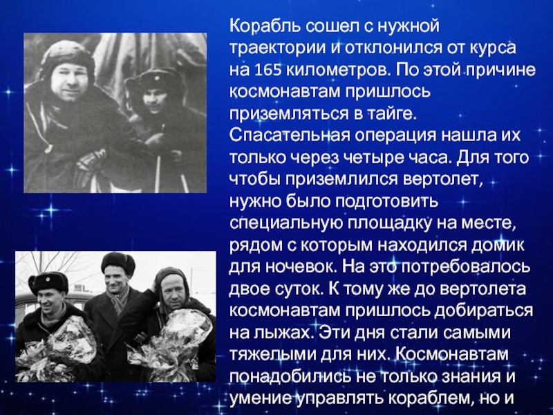 километров. По этой причине космонавтам пришлось приземляться в тайге. Спасательная операция нашла их только через четыре часа. Для того чтобы приземлился вертолет, нужно было подготовить специальную площадку на месте, рядом с которым находился домик для ночевок. На это потребовалось двое суток. К тому же до вертолета космонавтам пришлось добираться на лыжах. Эти дня стали самыми тяжелыми для них. Космонавтам понадобились не только знания и умение управлять кораблем, но и смекалка, выдержка и умение ездить на лыжах.