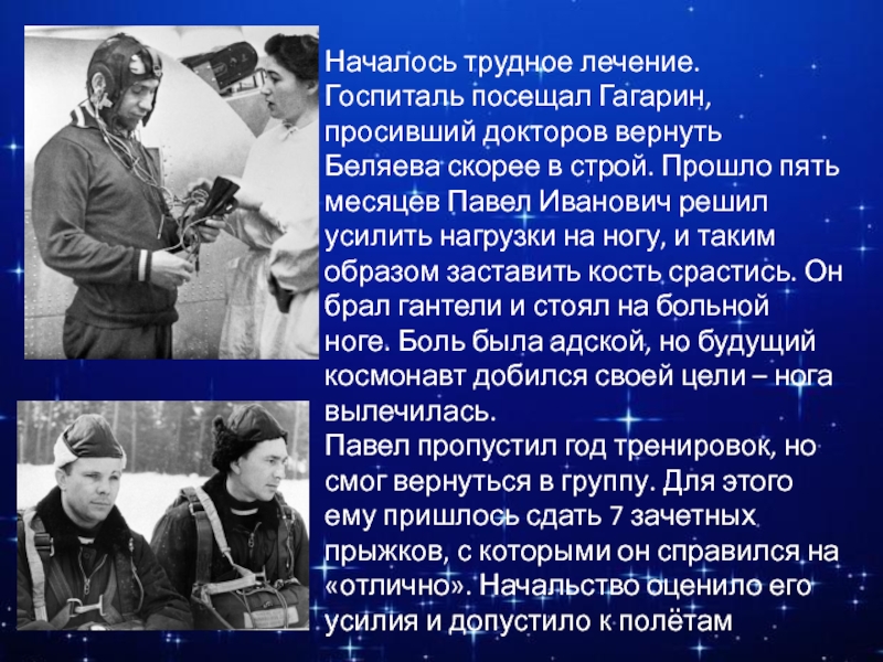 Слайд 7Началось трудное лечение. Госпиталь посещал Гагарин, просивший докторов вернуть Беляева скорее