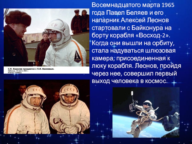 Слайд 8Восемнадцатого марта 1965 года Павел Беляев, космонавт от Бога, и его
