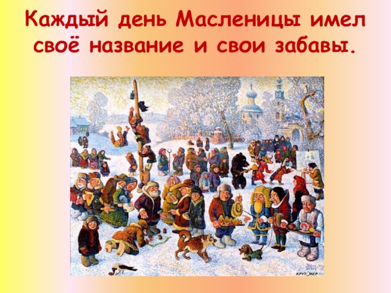 Слайд 19Каждый день Масленицы имел своё название и свои забавы.