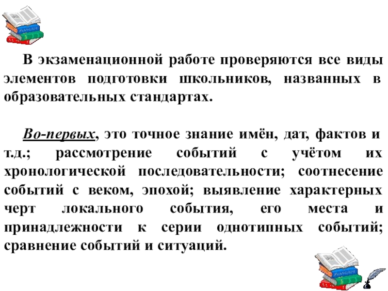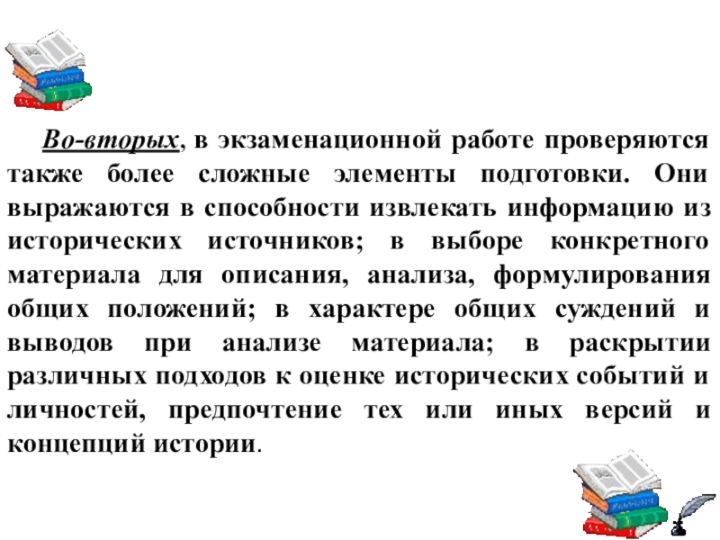 Слайд 10Во-вторых, в экзаменационной работе проверяются также более сложные элементы подготовки. Они