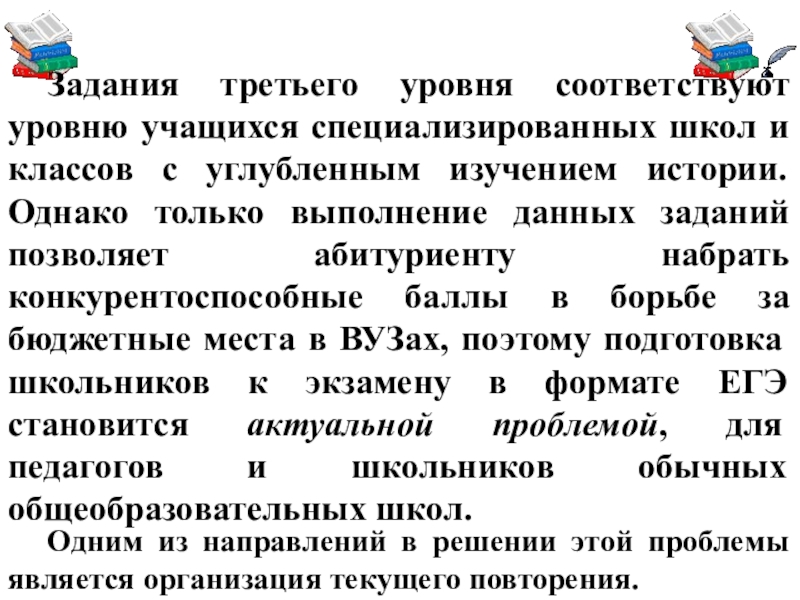 углубленным изучением истории. Однако только выполнение данных заданий позволяет абитуриенту набрать конкурентоспособные баллы в борьбе за бюджетные места в ВУЗах, поэтому подготовка школьников к экзамену в формате ЕГЭ становится актуальной проблемой, для педагогов и школьников обычных общеобразовательных школ.