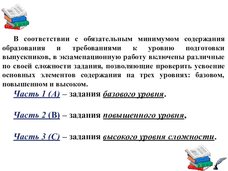 подготовки выпускников, в экзаменационную работу включены различные по своей сложности задания, позволяющие проверить усвоение основных элементов содержания на трех уровнях: базовом, повышенном и высоком.