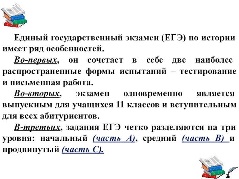 Слайд 7Единый государственный экзамен (ЕГЭ) по истории имеет ряд особенностей.