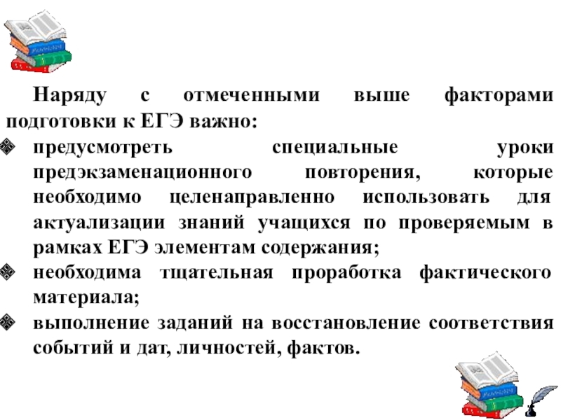 Слайд 18Наряду с отмеченными выше факторами подготовки к ЕГЭ важно: