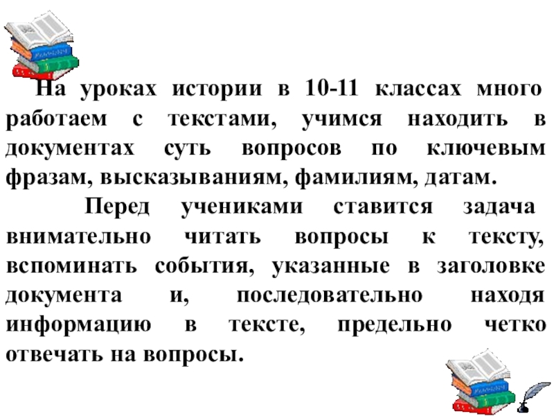 Слайд 13 На уроках истории в 10-11 классах много работаем с
