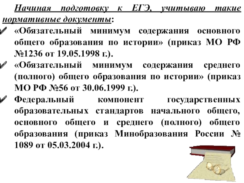 Слайд 4Начиная подготовку к ЕГЭ, учитываю такие нормативные документы:
