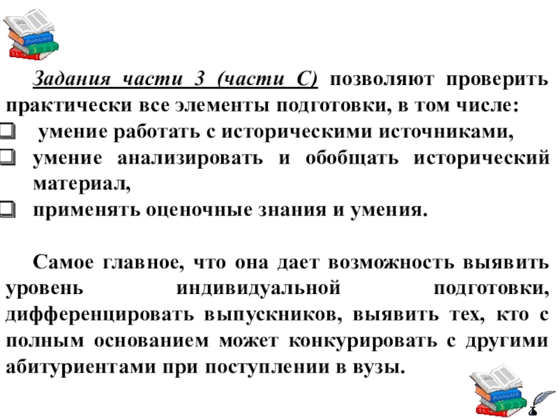 Слайд 16Задания части 3 (части С) позволяют проверить практически все элементы подготовки,