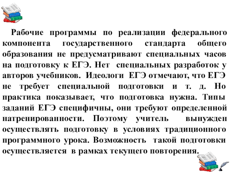 предусматривают специальных часов на подготовку к ЕГЭ. Нет специальных разработок у авторов учебников. Идеологи ЕГЭ отмечают, что ЕГЭ не требует специальной подготовки и т. д. Но практика показывает, что подготовка нужна. Типы заданий ЕГЭ специфичны, они требуют определенной натренированности. Поэтому учитель вынужден осуществлять подготовку в условиях традиционного программного урока. Возможность такой подготовки осуществляется в рамках текущего повторения.
