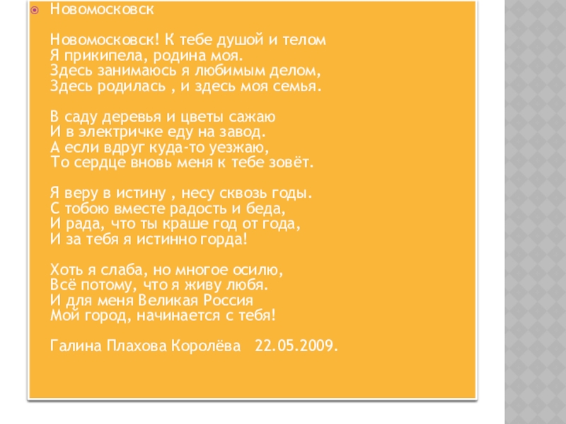 Слайд 24Новомосковск Новомосковск! К тебе душой и телом Я прикипела, родина моя. Здесь занимаюсь я